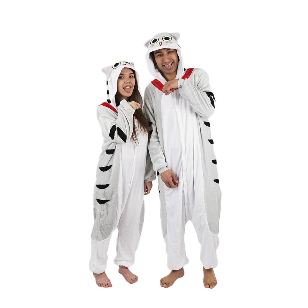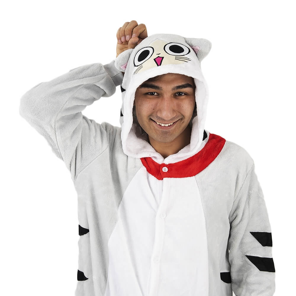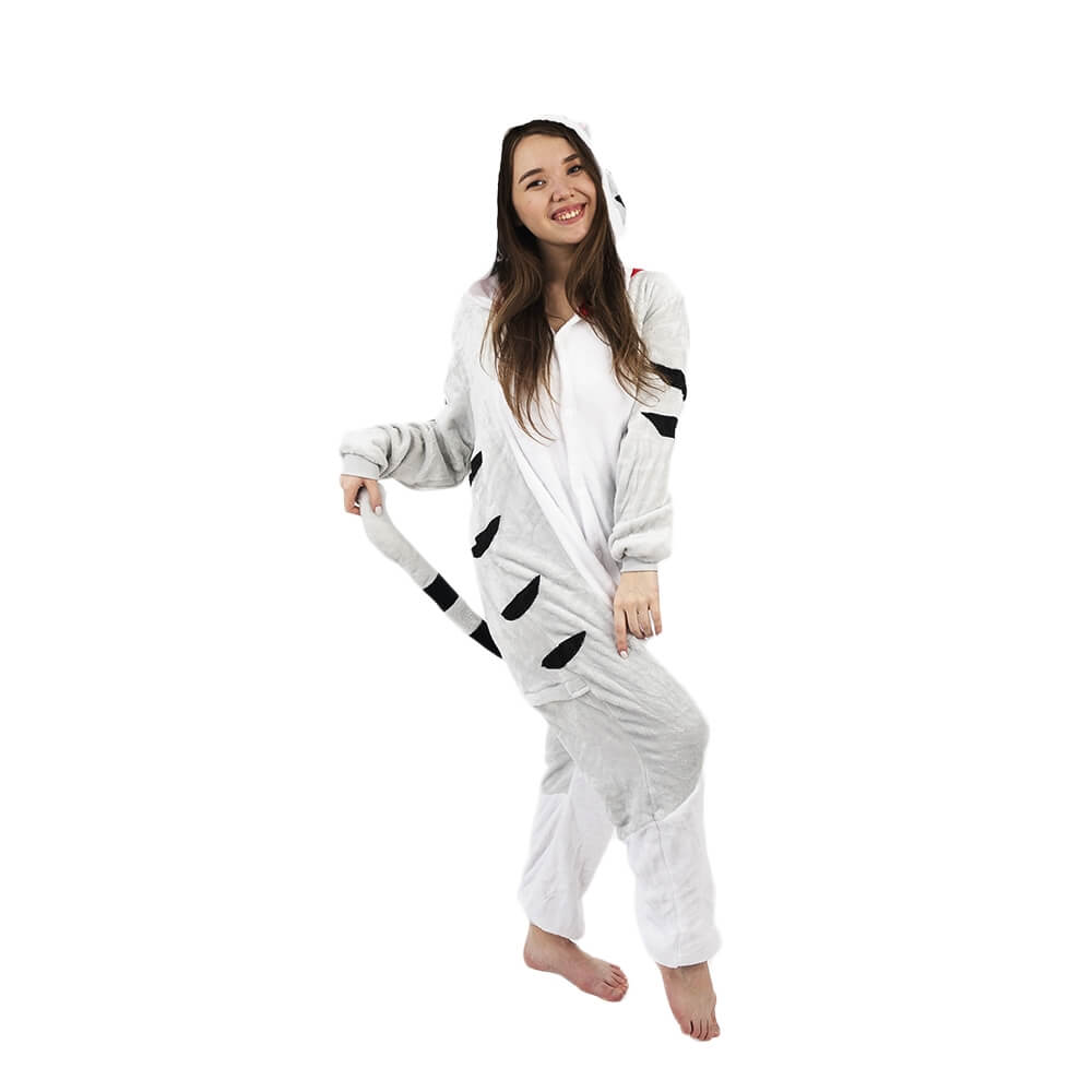 Котенок Чи – персонаж из мультфильма аниме. Кигуруми выполнен по мотивам этого мультфильма, а дизайн придает схожесть с персонажем. Бело-серая расцветка смотрится свежо и нарядно. Черные полосочки на хвосте, по бокам и на капюшоне придают игривости образу. Мордочка выполнена в технике аппликации с элементами вышивки.