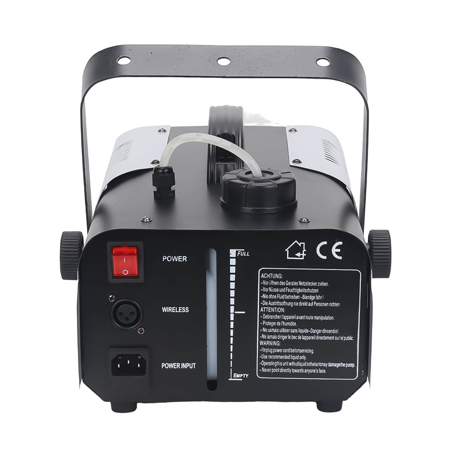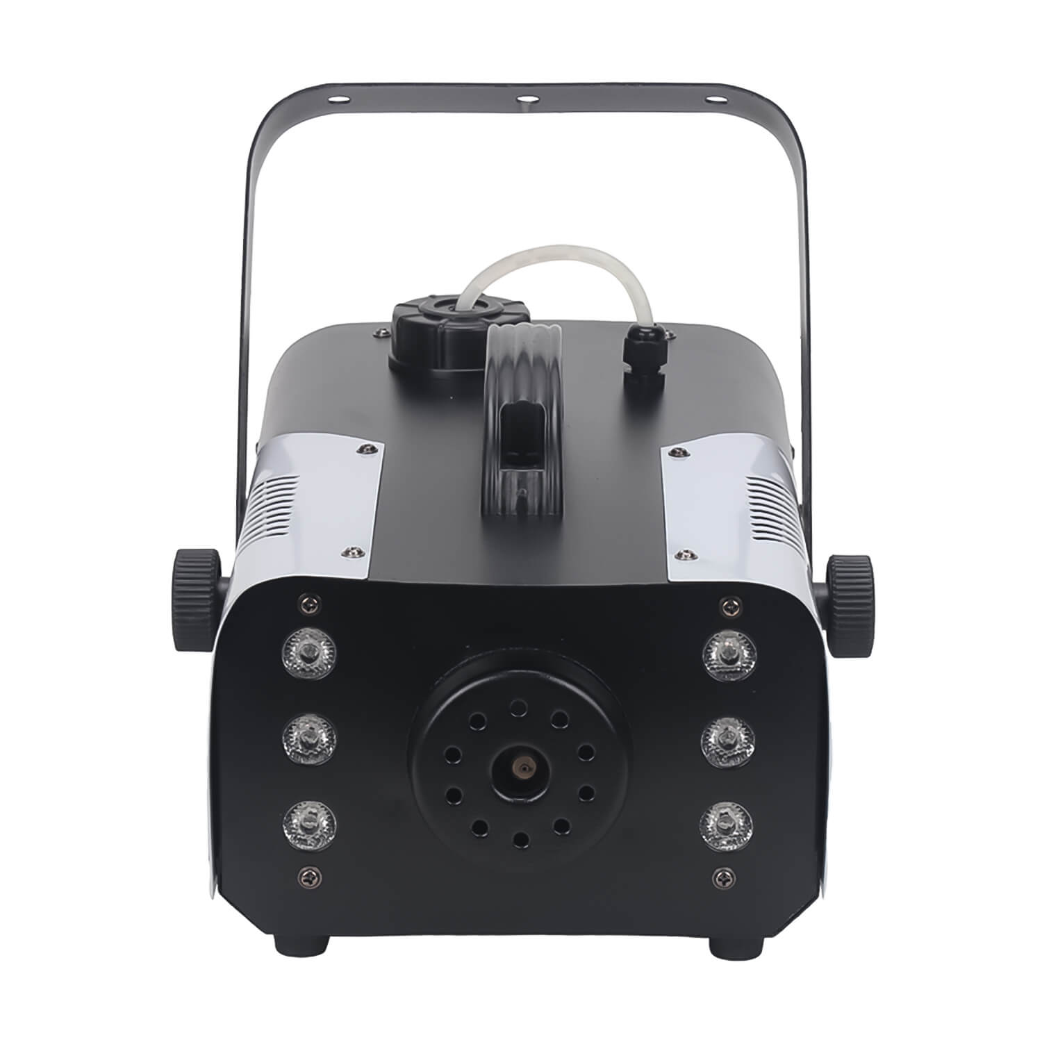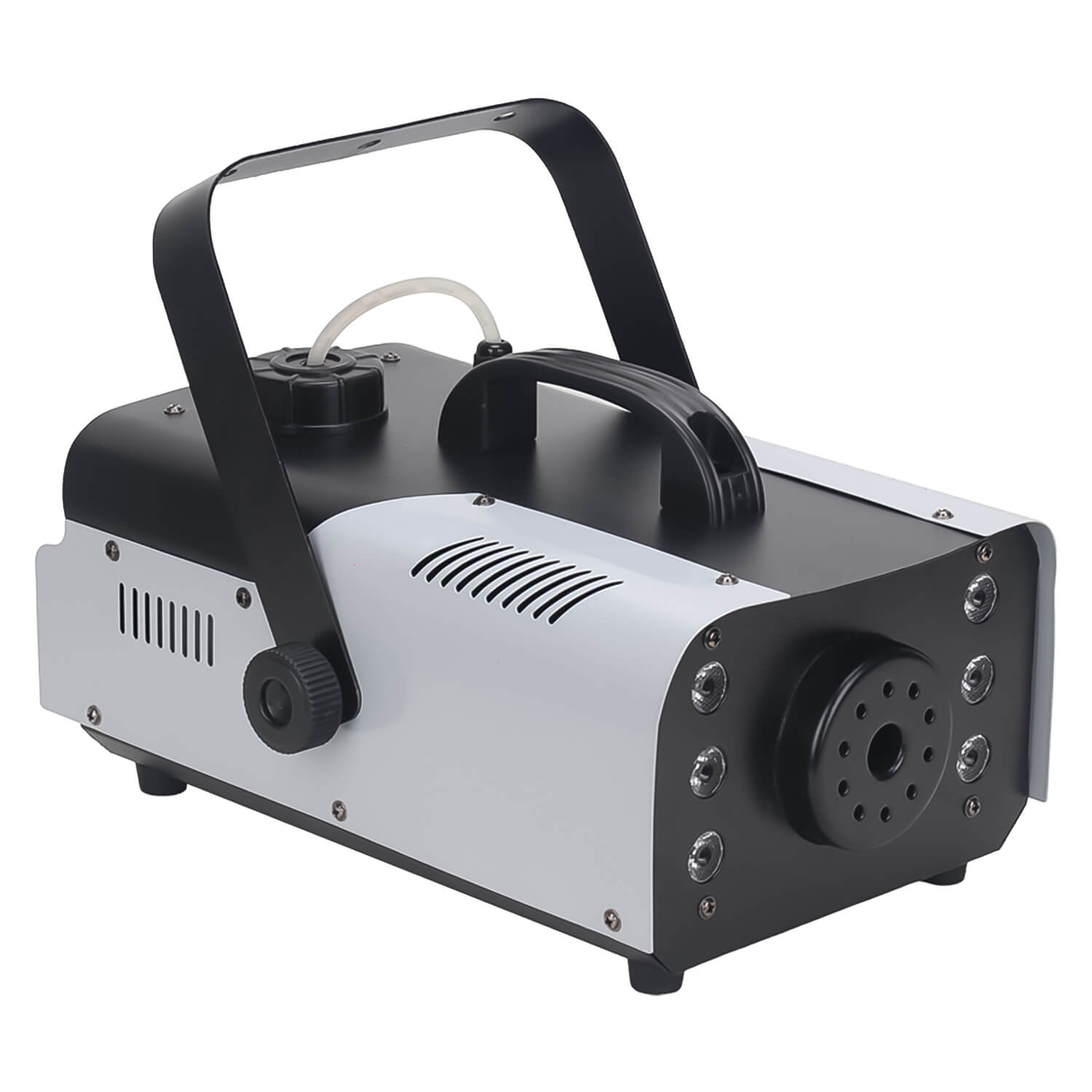 Компактный генератор дыма мощностью 900 Вт, дающий интенсивное и равномерное распределение дыма в помещении. Оснащен пультом дистанционного управления и проводным пультом. Дым-машина оснащена шестью RGB светодиодами, которые подсвечивают дым в момент его подачи, что делает эффект более ярким и красочным. Металлический нержавеющий корпус.