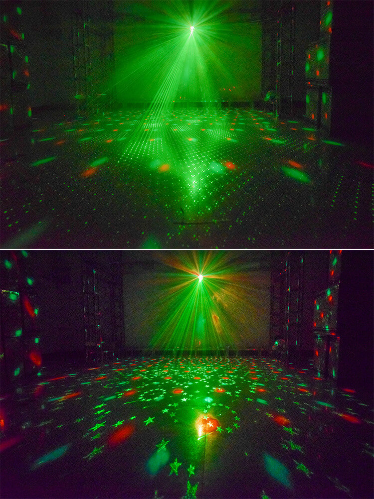 Лазерный проектор - дискошар музыкальный Party Light Box с пультом (RGB laser, LED, 120°) – полезное оборудование для дискотеки или вечеринки. Дискошар проектор светодиодный оснащен чувствительным датчиком звука, который улавливает мелодии и подстраивает под них подсветку в автоматическом режиме. Также режим можно выставить вручную с пульта управления. Светодиодный LED диско шар оснащен двумя мощными лазерами с углом наклона 120 градусов, которые охватывают помещение площадью до 50 кв.м. Световая установка-диско-шар выполнена из металла, поэтому корпусу не страшны падения и удары. На корпусе есть удобная ручка, за которую диско-шар можно подвесить или переносить.